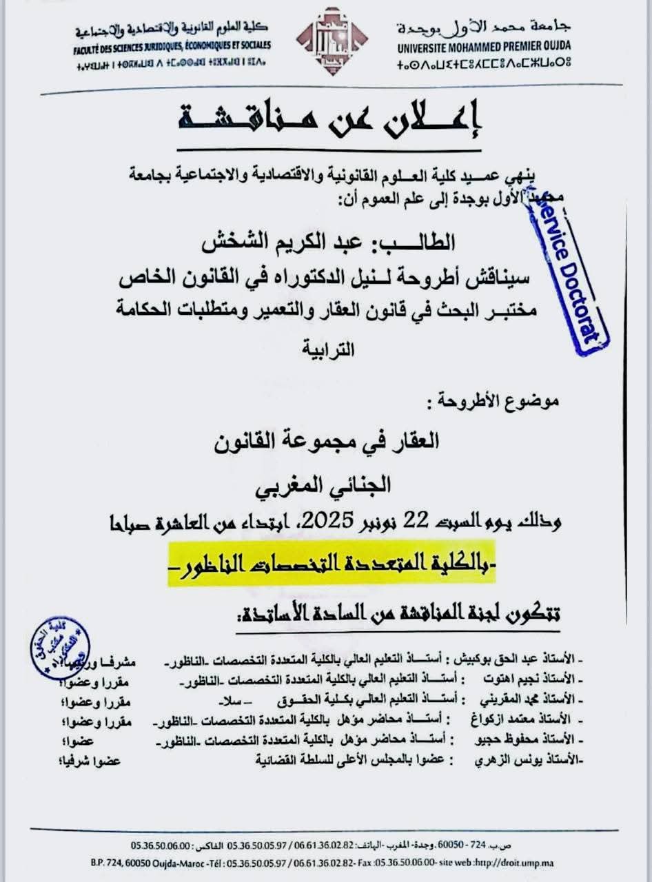 تستعد الكلية المتعددة التخصصات بالناظور لاحتضان حدث أكاديمي بارز، يتمثل في مناقشة أطروحة الدكتوراه للباحث عبد الكريم الشخش، القاضي بالمحكمة الابتدائية بالدريوش، وذلك يوم السبت 22 نونبر 2025 على الساعة العاشرة صباحاً.