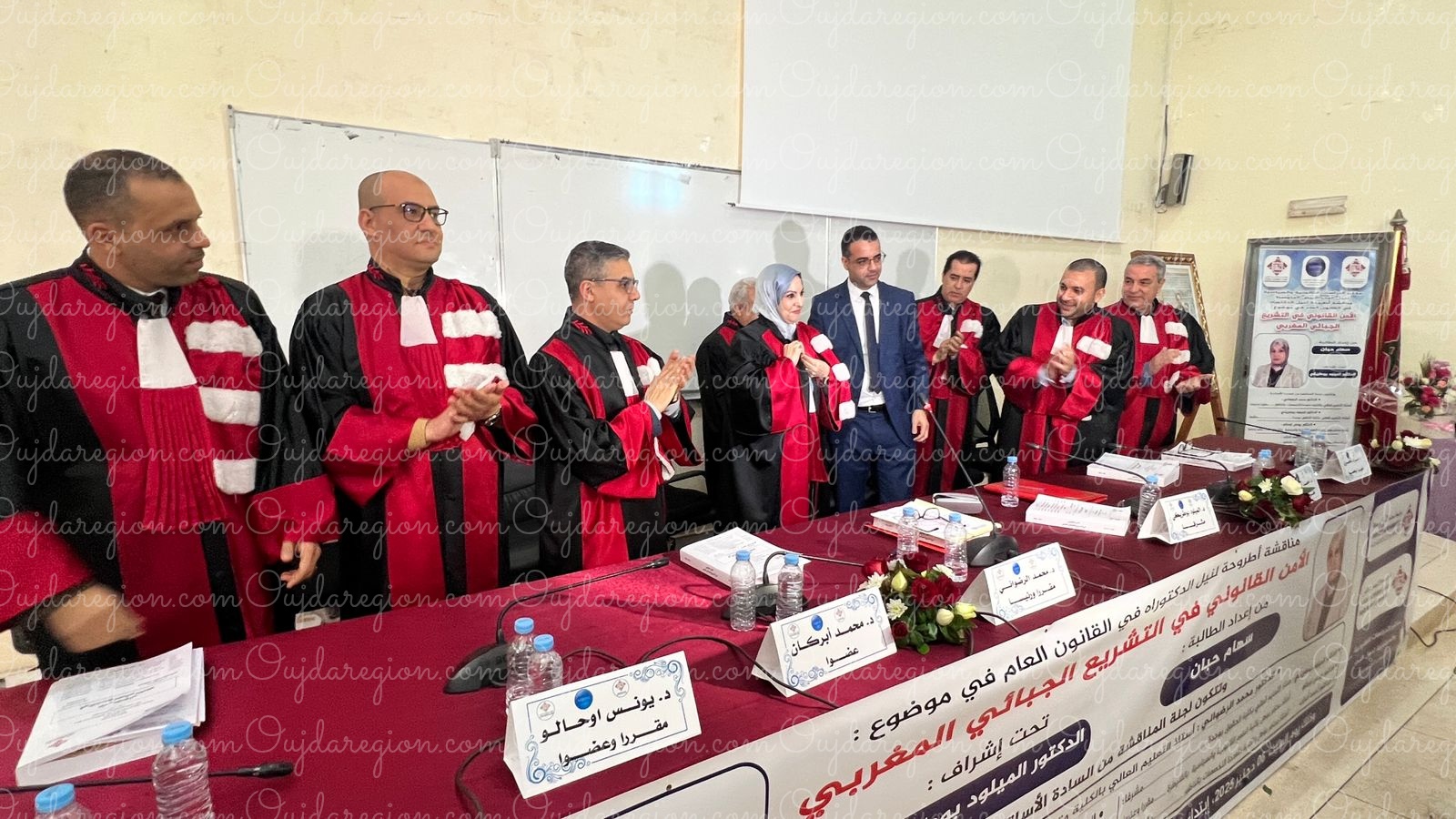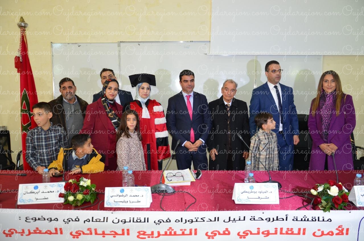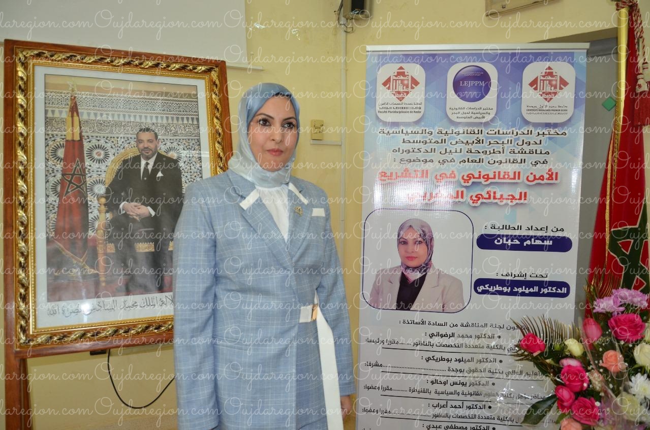 وفي ختام الجلسة، حصلت الطالبة الباحثة سهام حبان على الدكتوراه في القانون العام عن جدارة واستحقاق، وسط تنويه مستحق بمجهوداتها العلمية،مع توصية بالنشر ،لأهمية الموضوع على الساحة القانونية والحقوقية.
