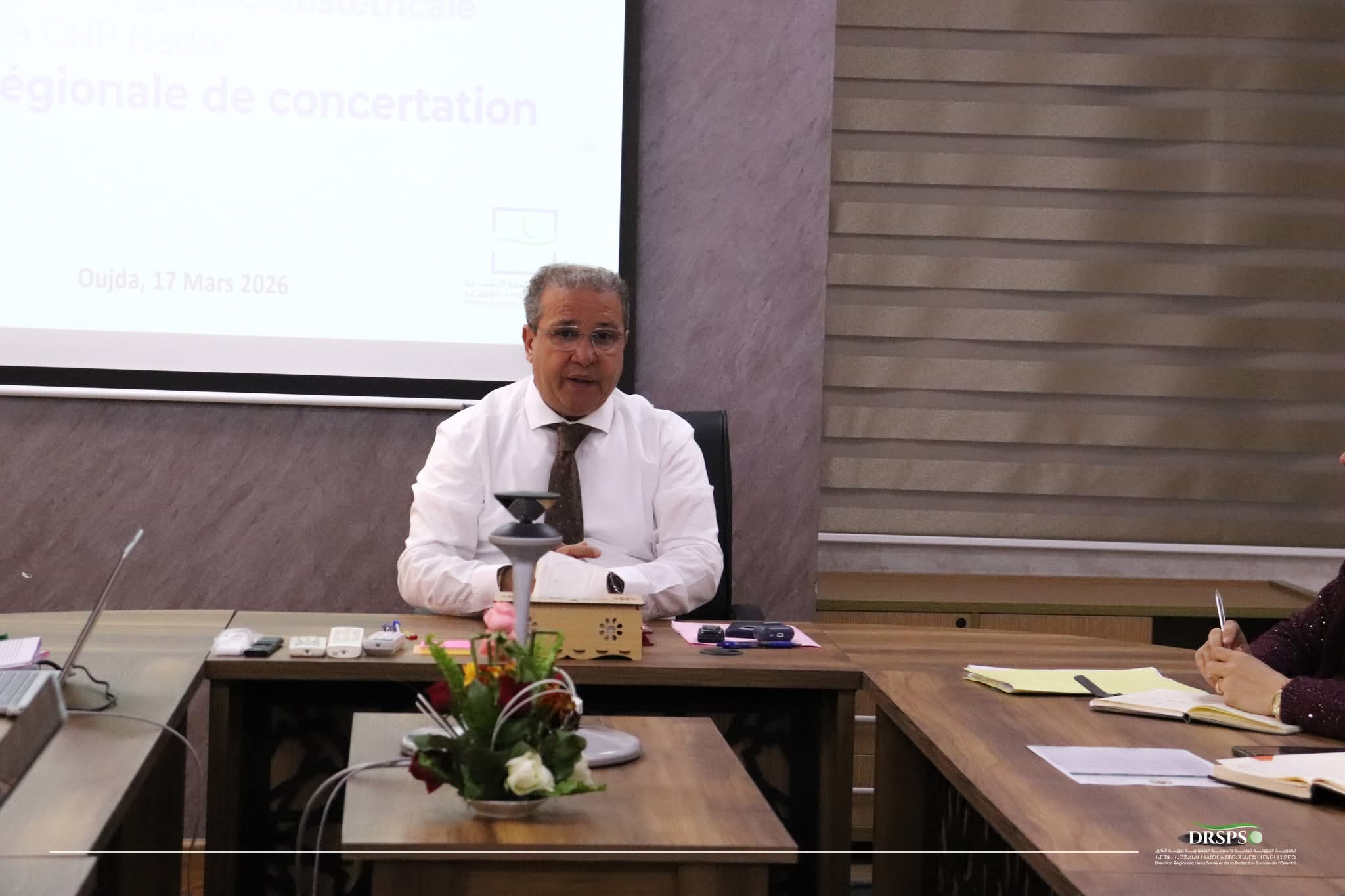 عرف هذا الاجتماع حضور السيدة مندوبة وزارة الصحة والحماية الاجتماعية بإقليم الناظور وبصفتها مديرة المستشفى الإقليمي بالناظور، السيد مندوب وزارة الصحة والحماية الاجتماعية بإقليم الدريوش وبصفته مدير المستشفى الإقليمي بالدريوش، إلى جانب رؤساء الأقطاب الطبية، أطباء الإنعاش والتخدير، أطباء أمراض النساء والتوليد، فضلاً عن أطر المديرية الجهوية، لاسيما السيدة رئيسة مصلحة المرصد الجهوي للصحة والسيد رئيس مصلحة العرض الصحي.
